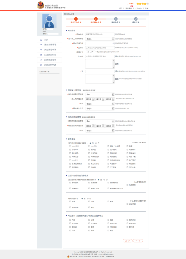 二、登录系统以后,按步骤填写网站主办单位信息、负责人信息及网站信息,进行提交