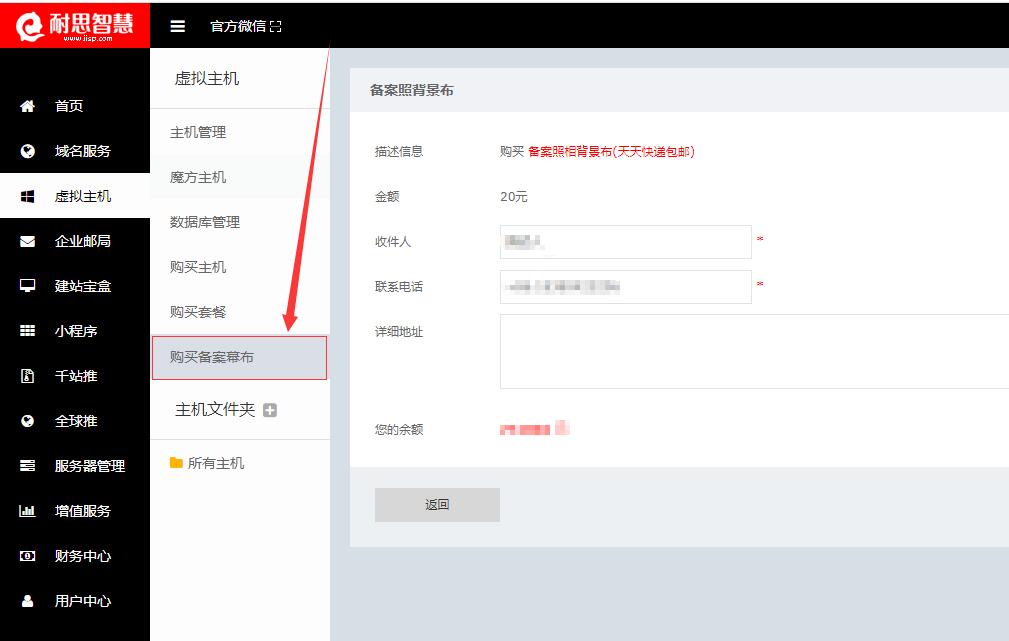 登陆用户后台控制中心,主机 → 购买备案照相背景布(如以下截图)