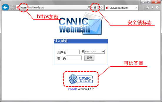 2) 地址栏中(不同的浏览器显示位置会略有差别)出现“安全锁”标志,点击此标志可查看证书信息;